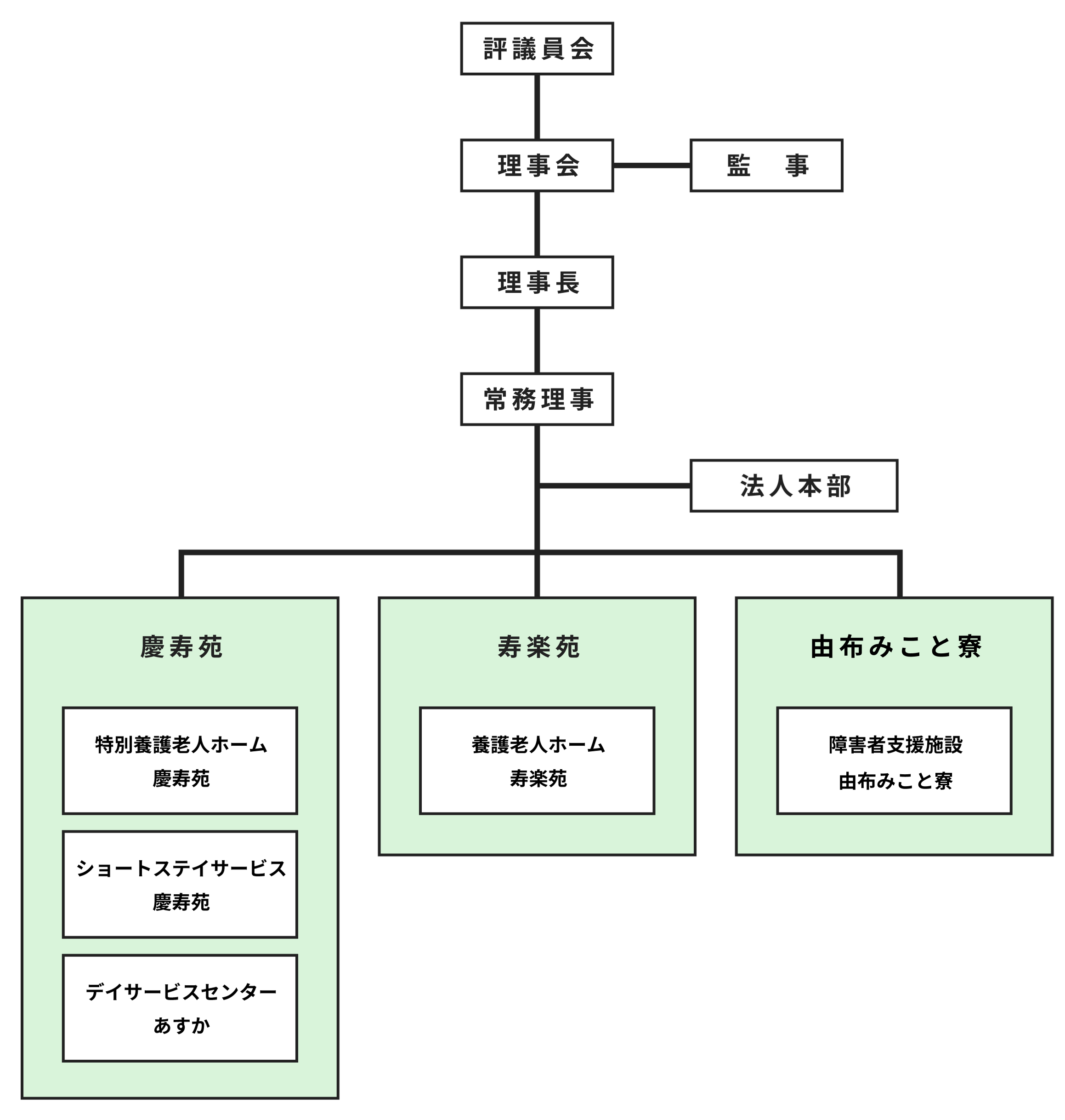 「寿永会」は大分県のほぼ中央に位置する由布市庄内町に、平成18年に設立されました。福祉の町、庄内町のシンボルともいえる中核的な福祉3施設、特別養護老人ホーム「慶寿苑」、養護老人ホーム「寿楽苑」、障害者支援施設「由布みこと寮」を運営しています。